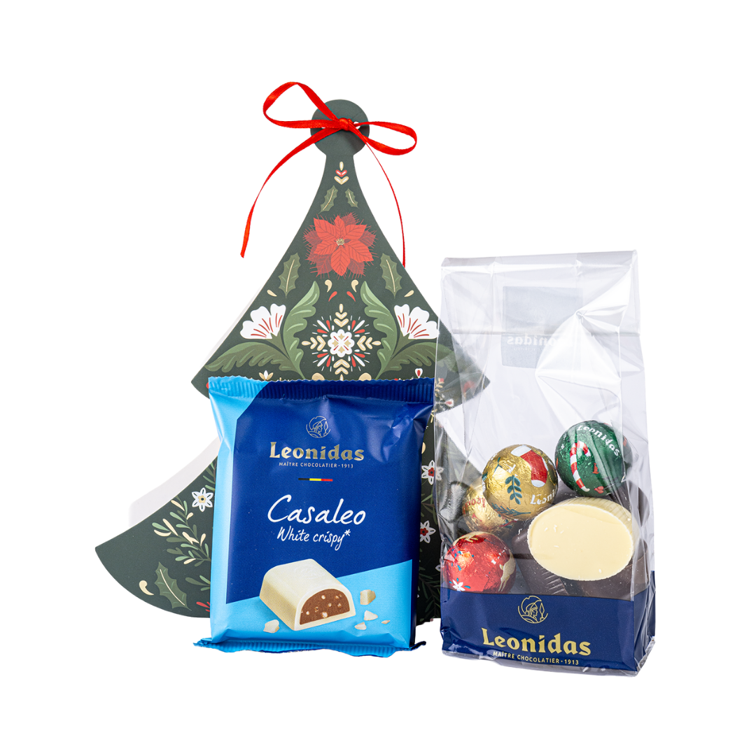 Gift Shiny Leonidas este o cutie din plastic aurie, cu glitter, ce conține: Rigletă Mini (60g), GIMBER shot 20ml, Figurină 40g, Degustation (9 praline/125g). Poza este cu titlu de prezentare iar sortimentele produselor pot diferi. Pungă cadou și hartie mătase incluse.